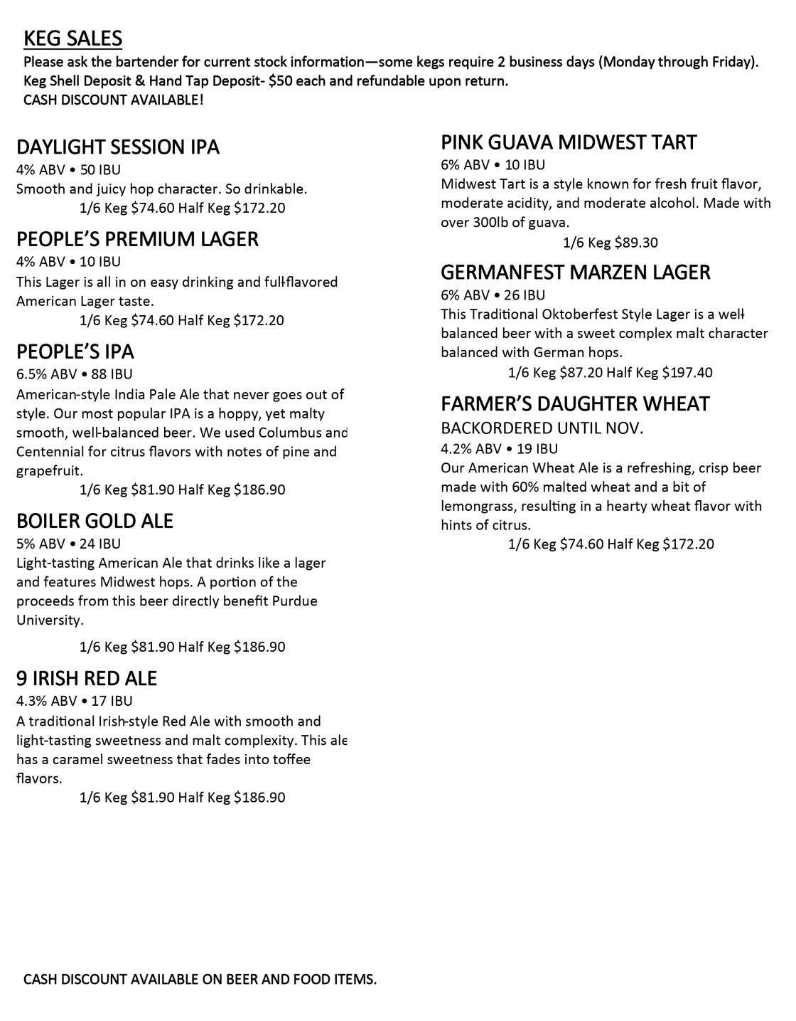*Due to Indiana state law, we can NOT sell kegs on Sundays. Please, plan accordingly. Kegs: 1/6 barrel=~662 ounces 1/2 barrel=~1984 ounces