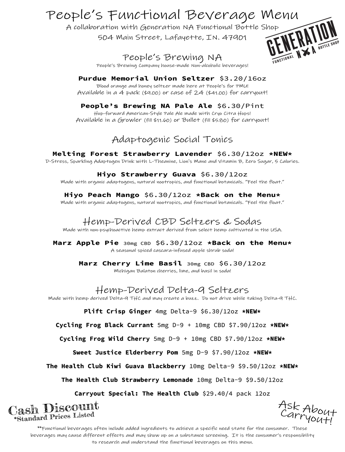 We have partnered with Generation NA to provide “People’s Functional Beverage Menu” to our Taproom guests! Maybe you aren’t a beer drinker or just not feeling like a beer, but you want to enjoy a night out with your friends, come check this new diverse menu of adult NA options. Let us know what you think?